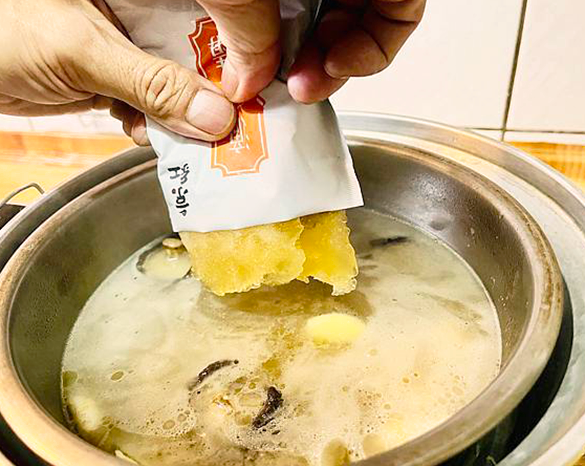 有時候她會加入高湯中燉煮或是蒸蛋、煮稀飯也加入一包,