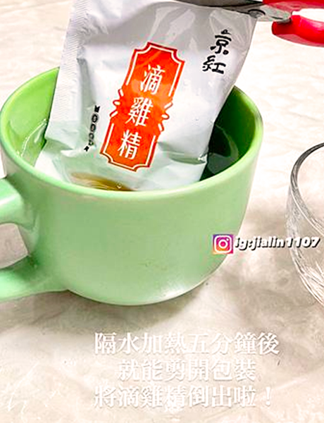 ▲ 隔水加熱5分鐘後,就能剪開包裝,將滴雞精倒出啦!